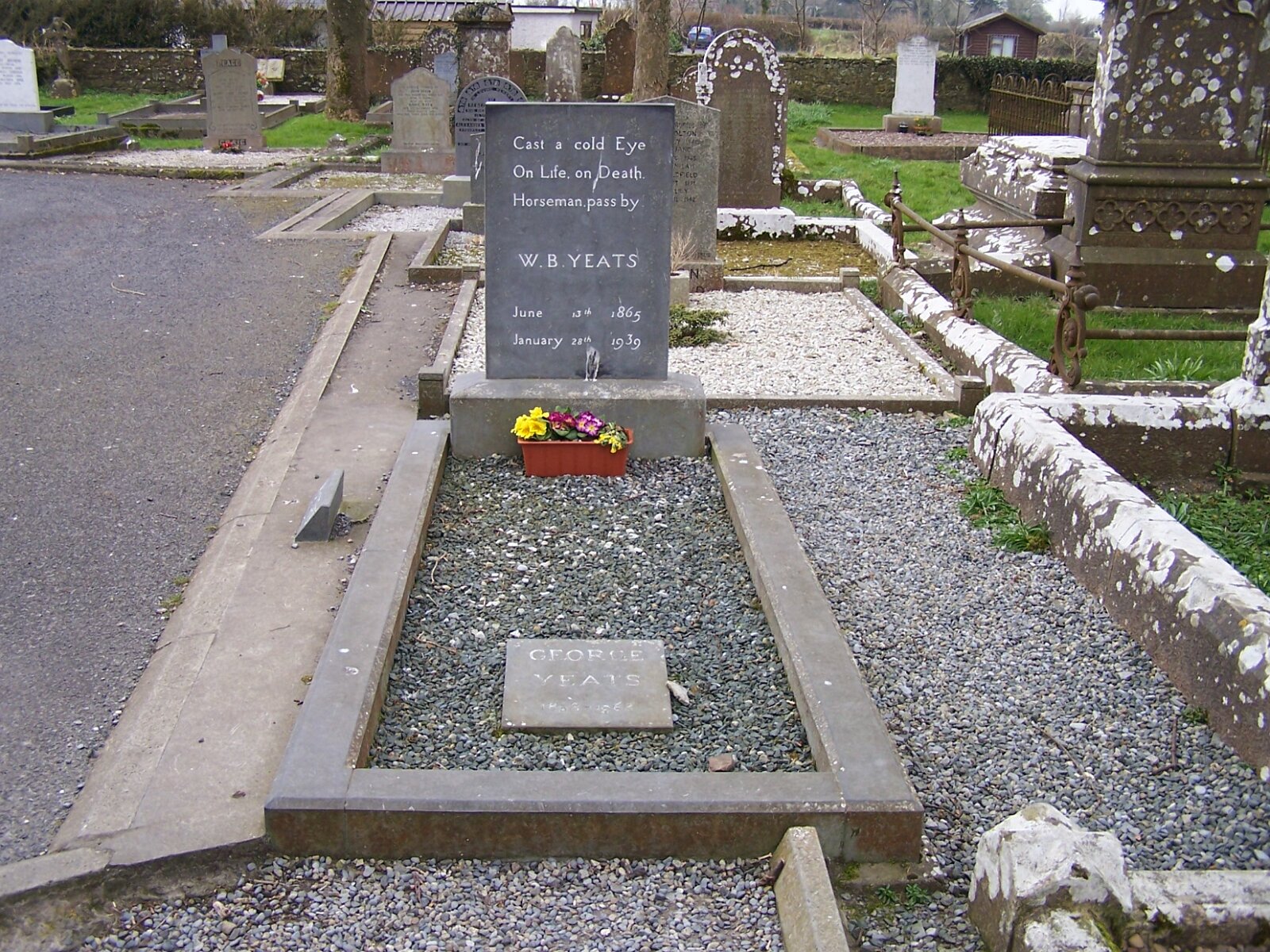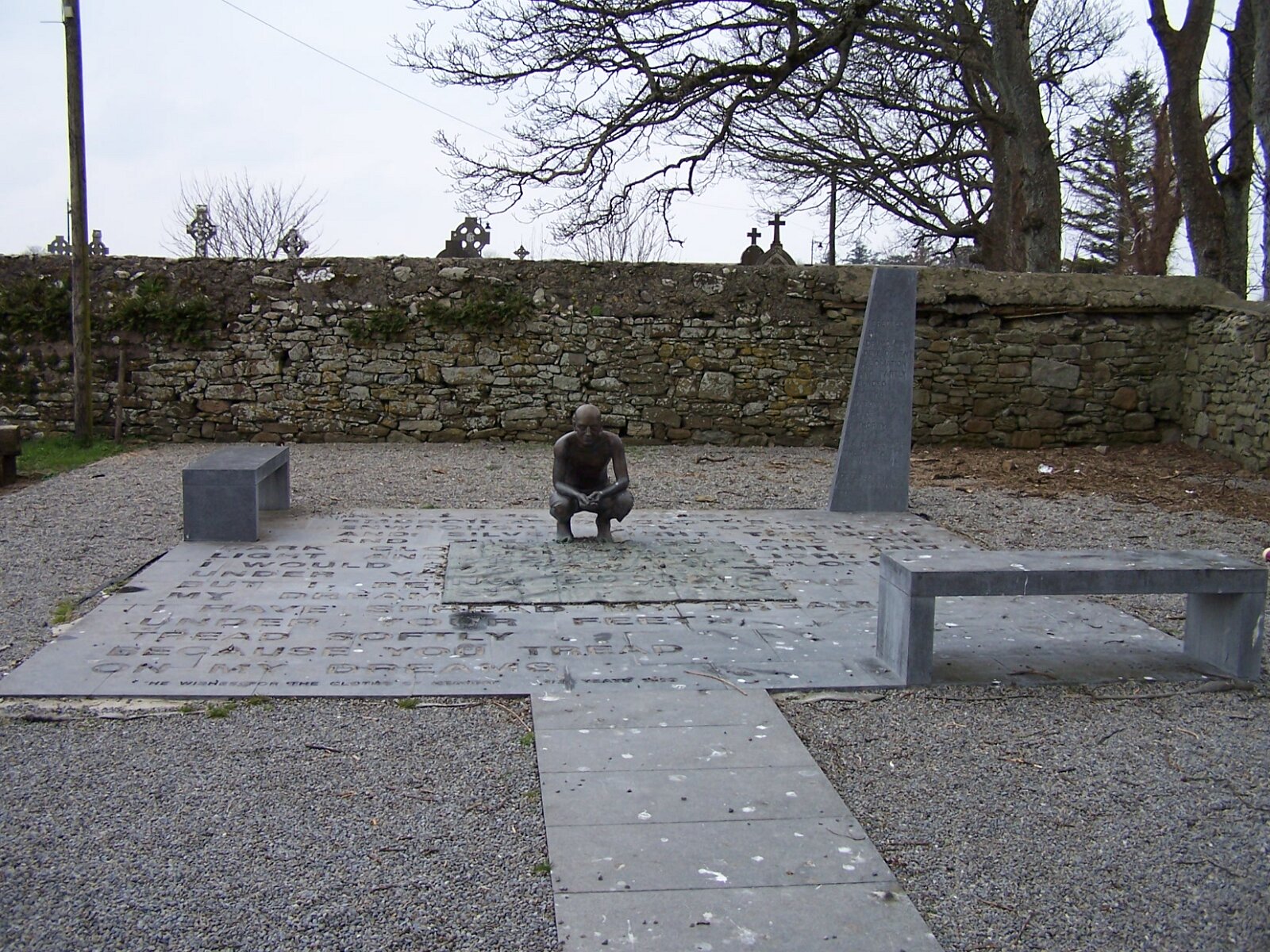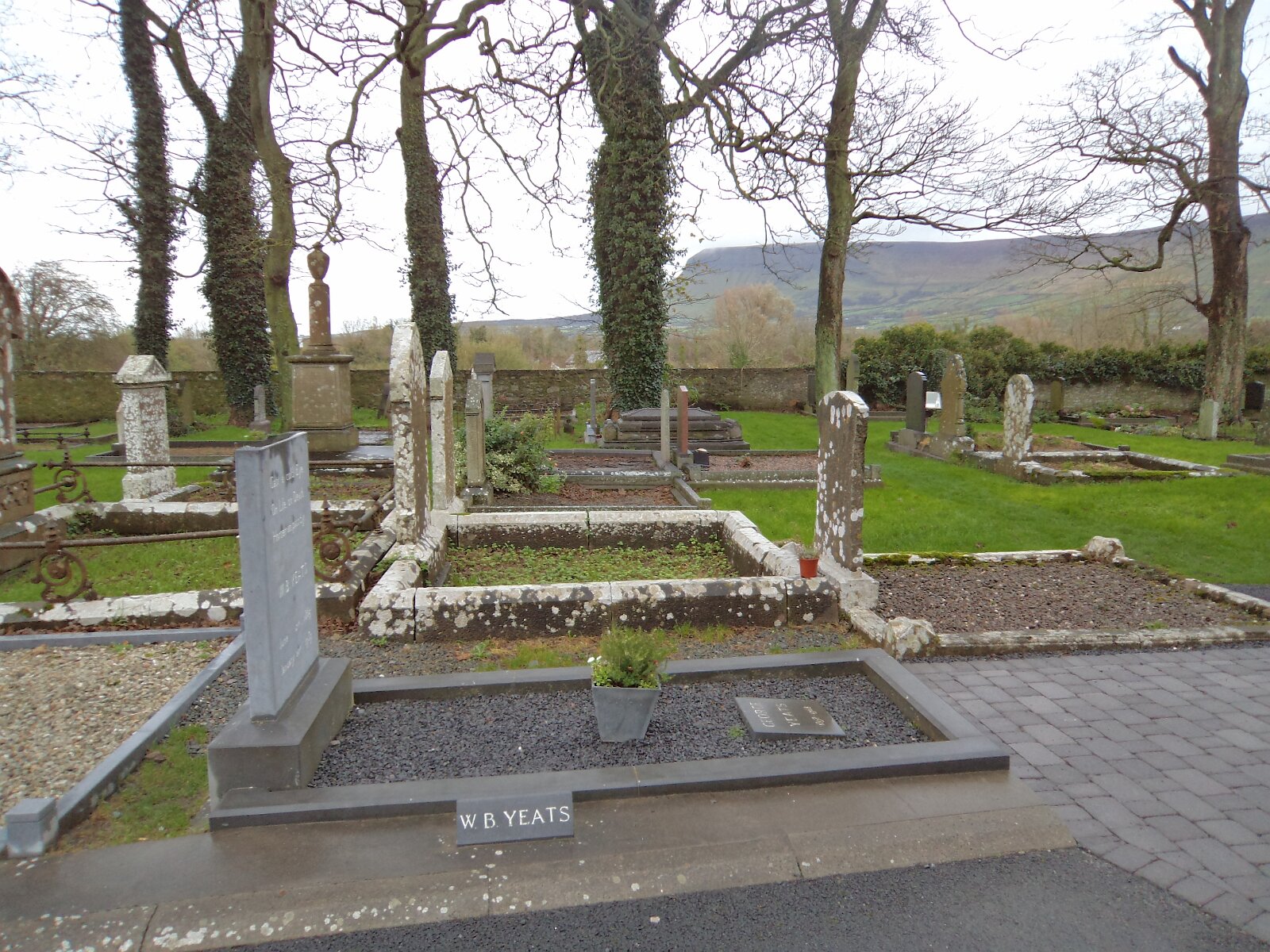 Billeder fra County Sligo i Irland Ahamlish ChurchBenbulbenCarrowmore Megalithic CemeteryCaves of KeshCreevykeel Burial MoundDooney Rock Forest ParkGleniff HorseshoeHazelwood Sculpture TrailKnocknareaLough TaltMoygara CastleMullaghmoreRaghly HarbourRosses PointSligo bySplit RockStrandhill Seaweed BathWilliam Butler Yeats grav i Drumcliff